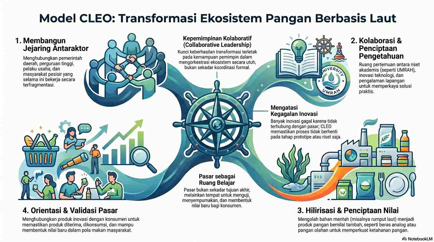 Persoalan utamanya terletak pada lemahnya harmonisasi antaraktor. Pemerintah bekerja dalam batas sektoralnya, perguruan tinggi menghasilkan riset yang tidak selalu terhubung dengan kebutuhan industri, pelaku usaha menghadapi keterbatasan skala, sementara masyarakat pesisir sering berada di posisi paling lemah dalam rantai nilai.